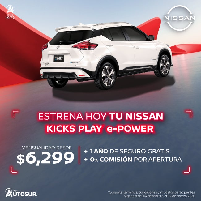 Se aplica para KICKS PLAY E-POWER PLATINUM 25 en plan tradicional Credi Nissan con el 40% de enganche a 72 meses, 1 año de seguro gratis y 0% comisión por apertura. Tasa anual de 2.56% y CAT promedio sin IVA de 3.5%. No aplica con otras promociones ni en compra de flotillas. Para conocer planes y modalidades de crédito, verificar precios, requisitos de contratación, Vigencia del 04 de febrero al 03 de marzo 2026.