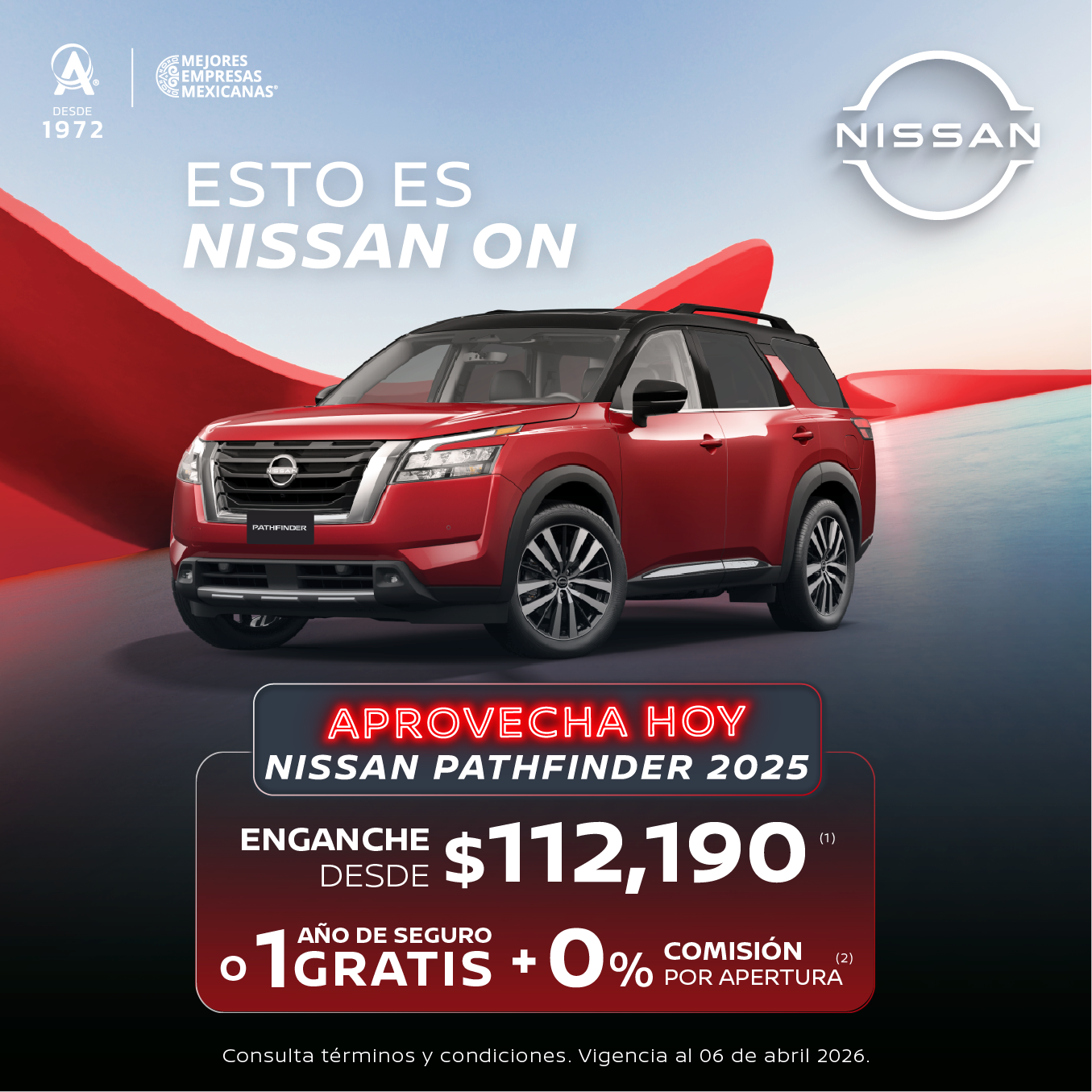 El importe corresponde al 10% de enganche en la versión PATHFINDER PLATINUM 4WD 25 sujeto a autorización de crédito por parte de CrediNissan. (2) Aplica para todas las versiones Pathfinder 2025 en operaciones de crédito celebradas con CrediNissan. No aplica con otras promociones ni en compra de flotillas. Para conocer planes y modalidades de crédito, verificar precios, requisitos de contratación, comisiones, disponibilidad, términos y condiciones, consulta a tu Distribuidor Autorizado Nissan. Vigencia del 03 al 31 de marzo 2026.